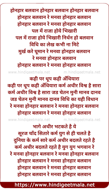 Lyrics of Honhar Balwan Re Manwa Honhar Balwan - होनहार बलवान रे मनवा होनहार बलवान