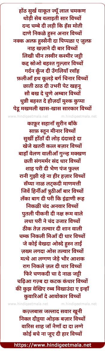 Lyrics of Honth Surkh Yaakut Jyun Laal Chamakan - होंठ सुर्ख याकूत ज्यूँ लाल चमकण थोड़ी सेब वलाइती सार विच्चों