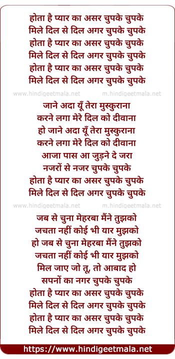 Lyrics of Hota Hai Pyar - होता है प्यार का असर चुपके चुपके