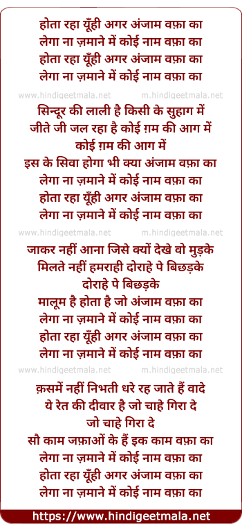 Lyrics of Hotaa Rahaa Yunhi Agar Anjaam Vafaa Kaa - होता रहा यूँही अगर अंजाम वफ़ा का