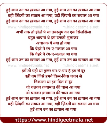 Lyrics of Hui Shaam Unakaa Kayaal Aa Gayaa - हुई शाम उन का ख़याल आ गया