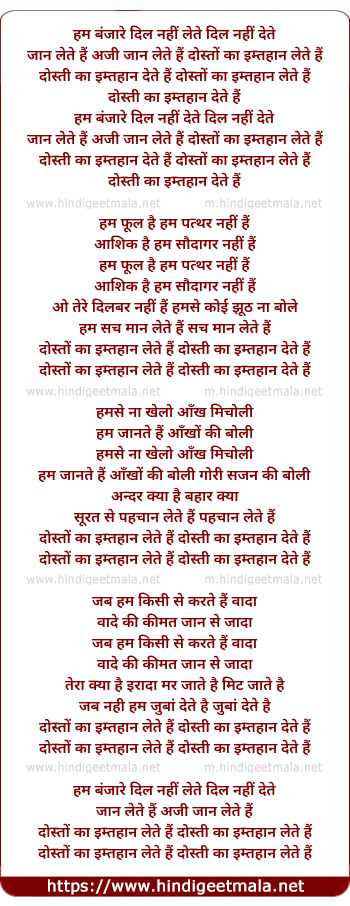 Lyrics of Hum Banjare Dil Nahi Lete Dil Nahi Dete - हम बंजारे दिल नहीं लेते दिल नहीं देते