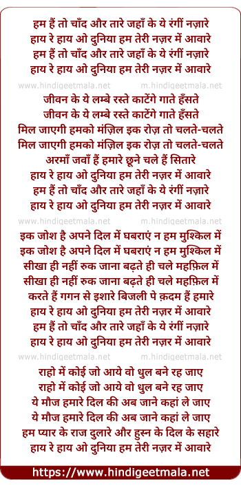 Lyrics of Hum Hai To Chand Aur Tare Jaha Ke Ye Rangin Najare - हम हैं तो चाँद और तारे जहाँ के ये रंगीं नज़ारे