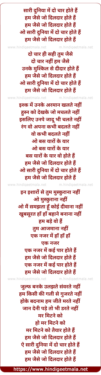 Lyrics of Hum Jaise Jo Dildaar Hote Hain - हम जैसे जो दिलदार होते हैं