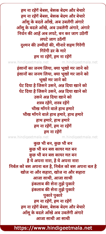 Lyrics of Hum Na Rahenge Bebas - हम ना रहेंगें बेबस, बेसक बेदम और बेचारे
