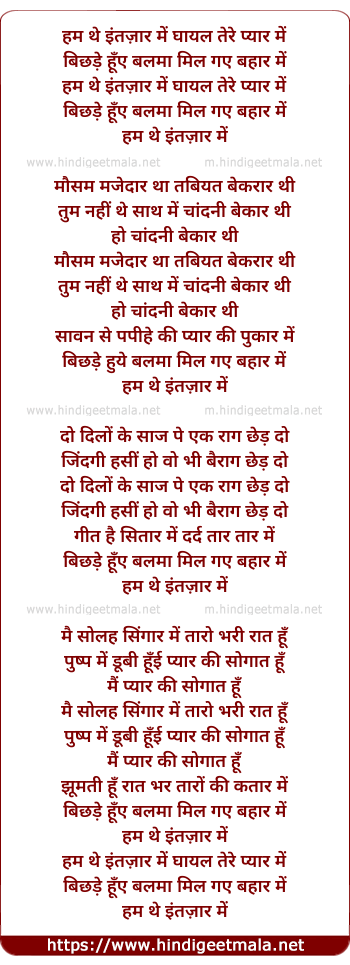 Lyrics of Hum The Intzar Me Ghayal Tere Pyar Me - हम थे इंतज़ार में घायल तेरे प्यार में