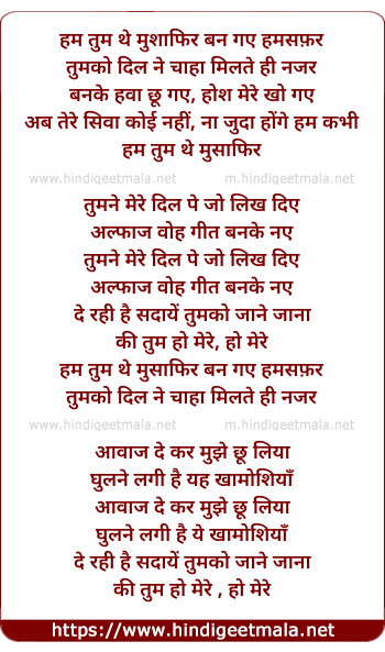 Lyrics of Hum Tum The Musaafir - हम तुम थे मुशाफिर बन गए हमसफ़र