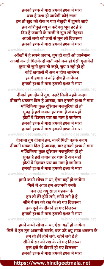 Lyrics of Humko Ishq Ne Maara - हमको इश्क ने मारा