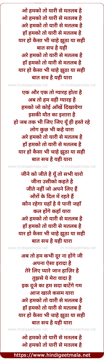 Lyrics of Humko To Yaari Se Matlab Hai - हमको तो यारी से मतलब है