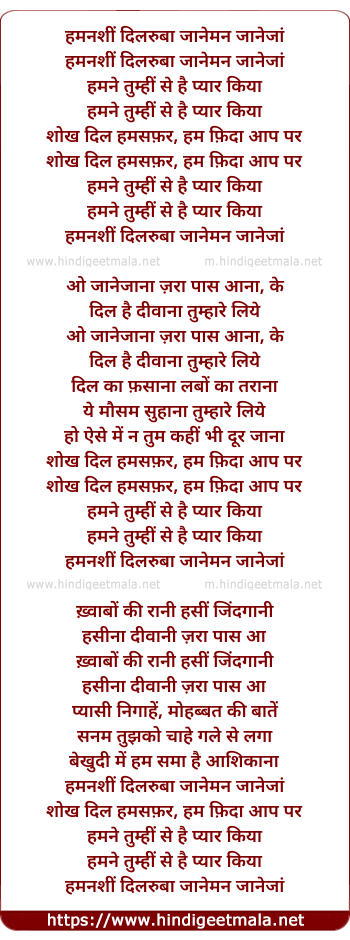 Lyrics of Humnashin Dilrubaa Janeman Janeja - हमनशीं दिलरुबा जानेमन जानेजां