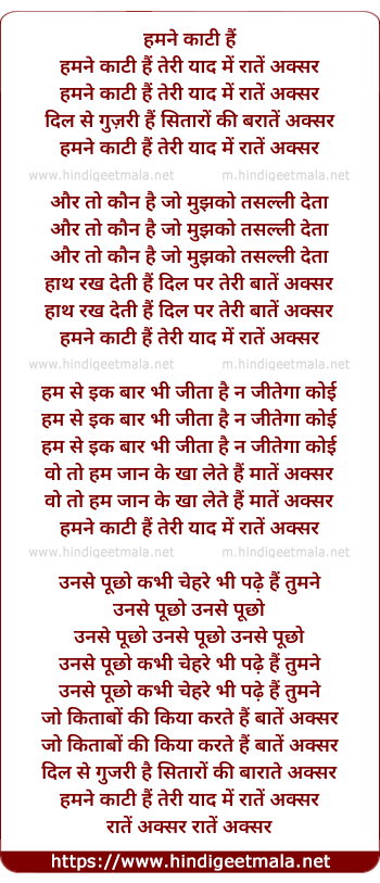 Lyrics of Humne Kaati Hai Teri Yaado - हमने काटी हैं तेरी यादों