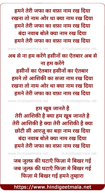 Lyrics of Humne Teri Jafa Ka Wafa Ka Naam Rakh Diya - हमने तेरी जफा का वफ़ा नाम रख दिया