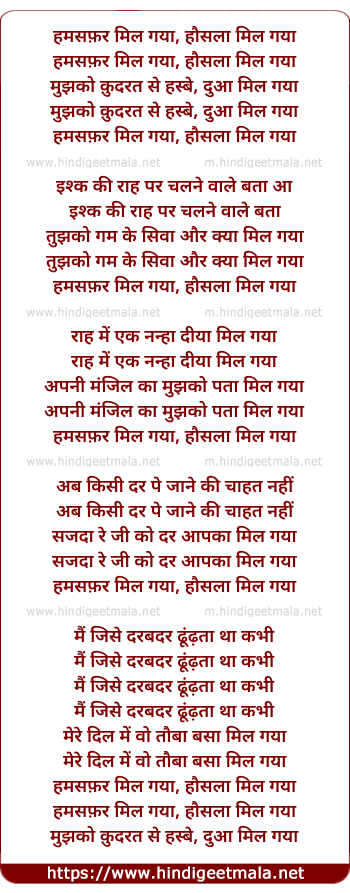 Lyrics of Humsafar Mil Gaya - हमसफ़र मिल गया, हौसला मिल गया