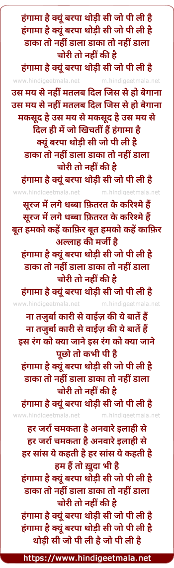 Lyrics of Hungama Hai Kyun Barpaa - हंगामा है क्यूं बरपा थोड़ी सी जो पी ली है