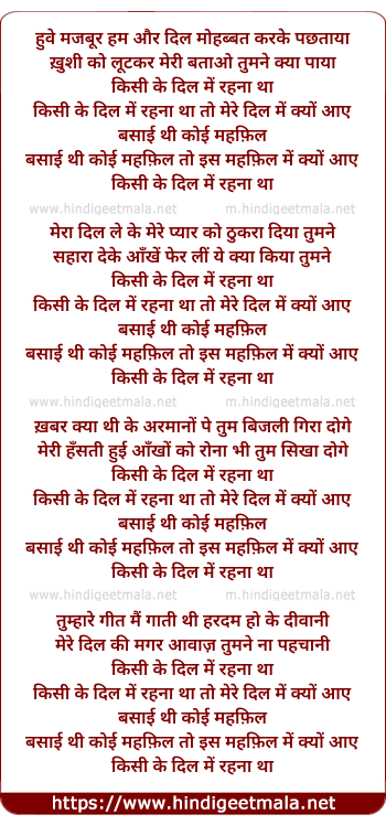 Lyrics of Huve Majabur Ham, Kisi Ke Dil Men Rahana Tha - हुवे मजबूर हम ,किसी के दिल में रहना था