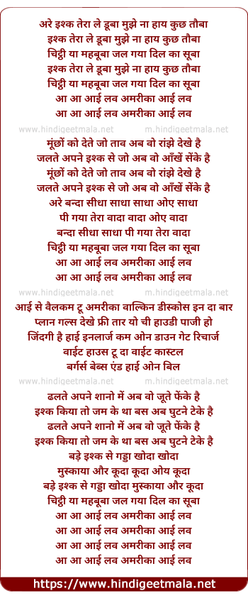 Lyrics of I Love Amreeka - अरे इश्क तेरा ले डूबा मुझे ना हाय कुछ तौबा