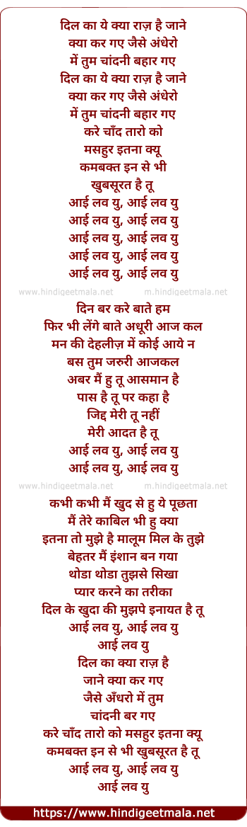 Poetic Translation - Lyrics of I Love You (Unplugged) - दिल का ये क्या राज़ है जाने