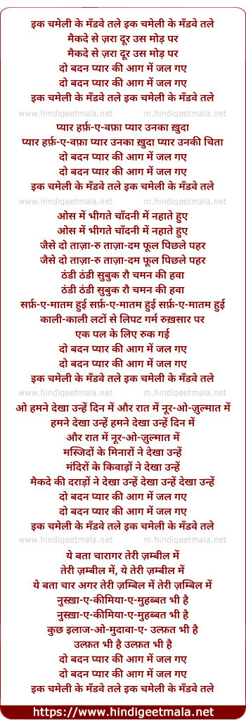 Lyrics of Ik Chamelee Key Mandave Tale - इक चमेली के मँडवे तले