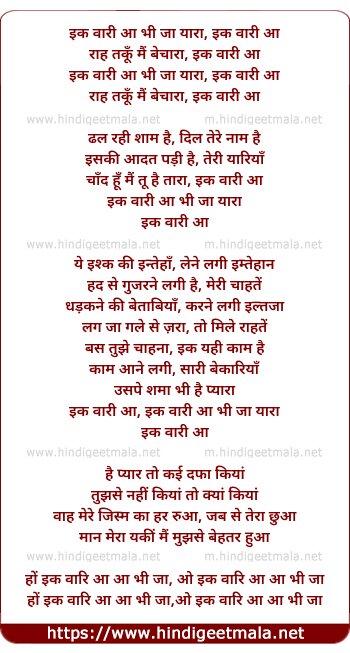 Lyrics of Ik Vaari Aa Bhi Ja Yaara (Jubin Version) - इक वारी आ भी जा यारा ( जुबिन वर्शन )