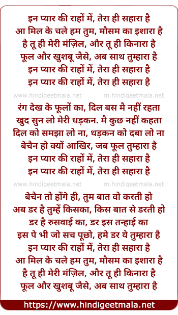 Lyrics of In Pyar Ki Raho Me, Tera Hi Sahara Hai - इन प्यार की राहों में, तेरा ही सहारा है