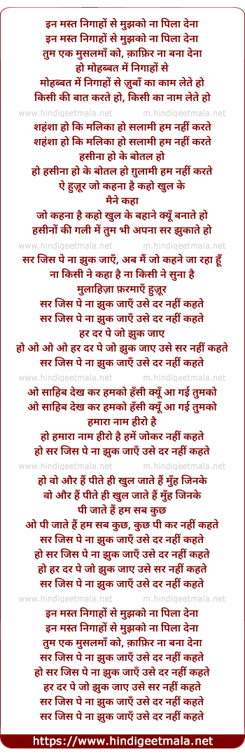 Lyrics of Inn Mast Nigaaho Se Mujhko Na Pila Dena - इन मस्त निगाहों से मुझको ना पिला देना