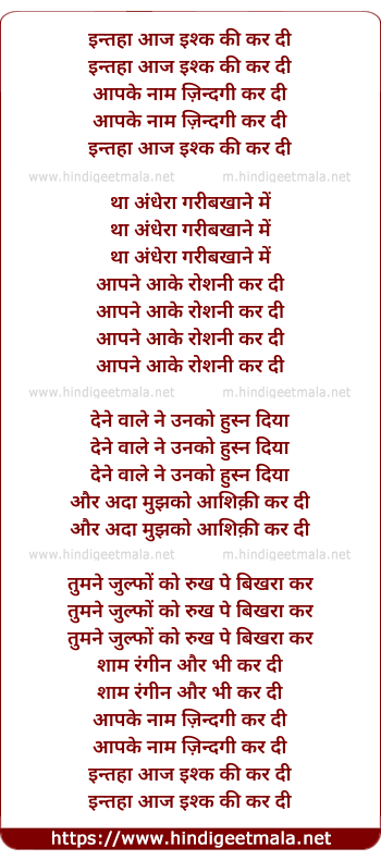 Lyrics of Inteha Aaj Ishq Ki Kardi - इन्तहा आज इश्क की कर दी