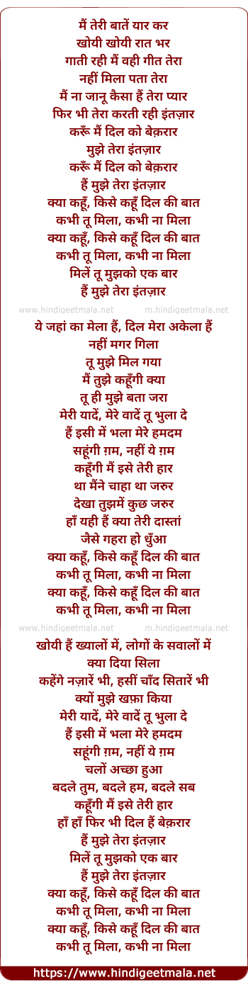 Lyrics of Intezar (Suneeta Rao) - मैं तेरी बातें यार कर