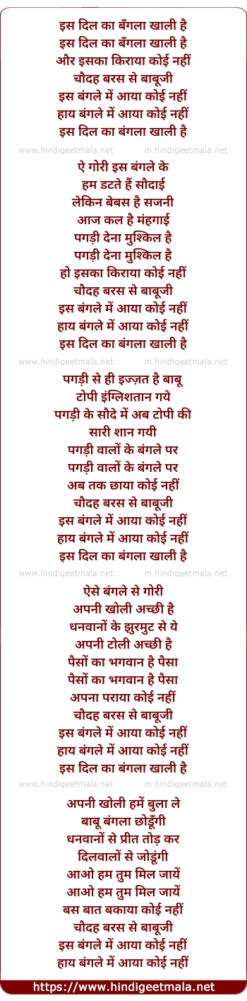 Lyrics of Is Dil Ka Bangla Khali Hai - इस दिल का बँगला खाली है