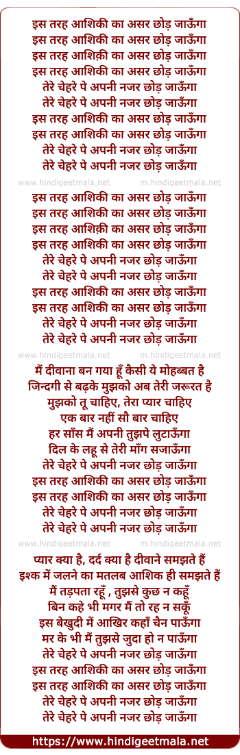 Lyrics of Is Tarah Aashiqui Ka Asar Chod Jaonga (2) - इस तरह आशिकी का असर छोड़ जाऊँगा