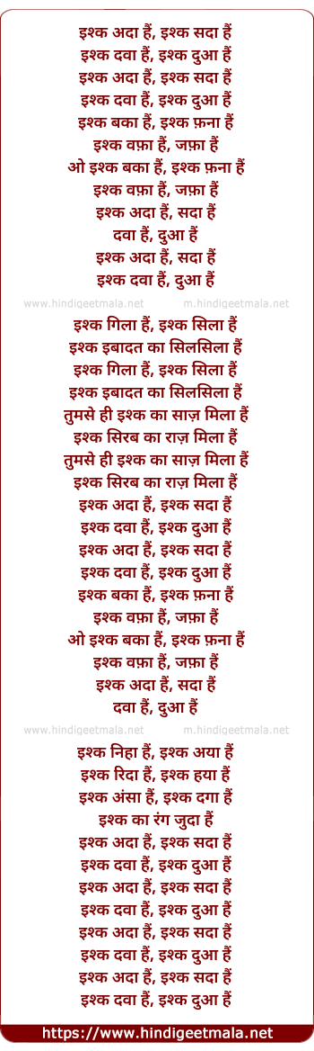 Lyrics of Ishq Ada Hai, Ishq Sada Hai - इश्क अदा हैं, इश्क सदा हैं