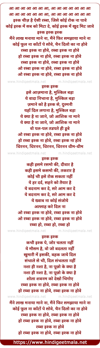 Lyrics of Ishq Chiz Hai Aisi, Maine Laakh Manaayaa, Rabbaa Ishq Na Hove - इश्क चीज़ है ऐसी, मैंने लाख मनाया, रब्बा इश्क ना होवे