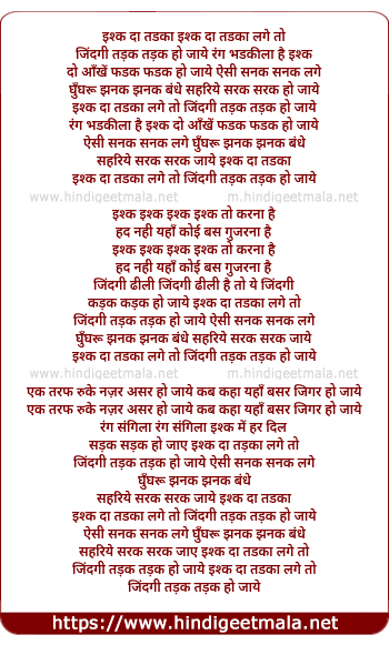 Lyrics of Ishq Da Tadka Lage To Jindagi Tadak Tadak Ho Jaye - इश्क दा तड़का लगे तो जिंदगी तड़क तड़क हो जाये