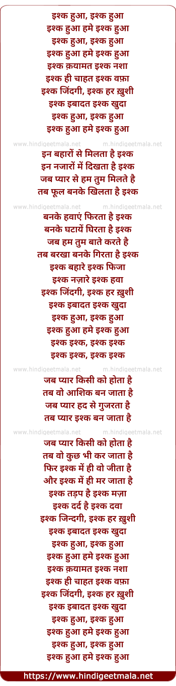 Lyrics of Ishq Hua Hume Ishq Hua - Ll - इश्क हुआ हमें इश्क हुआ