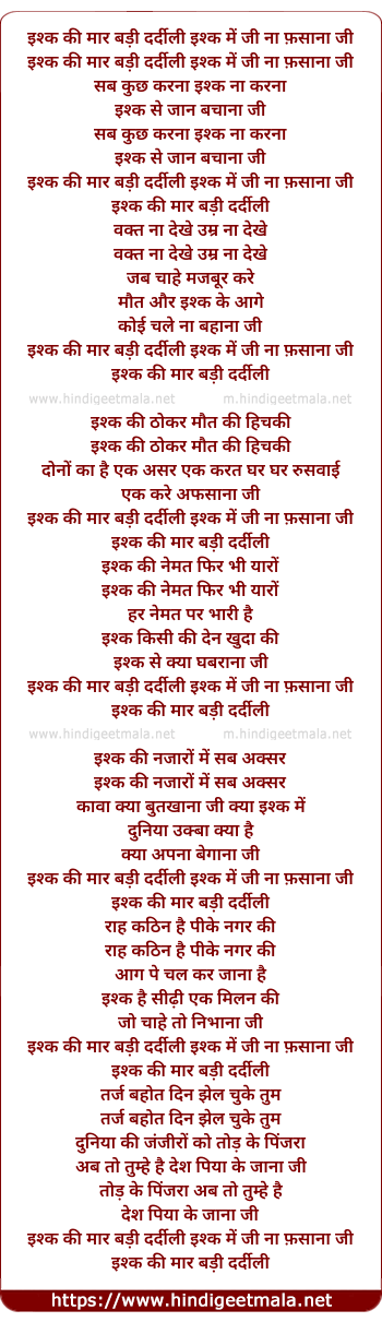 Lyrics of Ishq Ki Maar Badi Dardili - इश्क की मार बड़ी दर्दीली इश्क में जी ना फ़साना जी