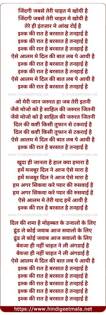 Lyrics of Ishq Ki Raat Hai Barsaat Hai Tanhaai Hai - इश्क की रात है बरसात है तनहाई है