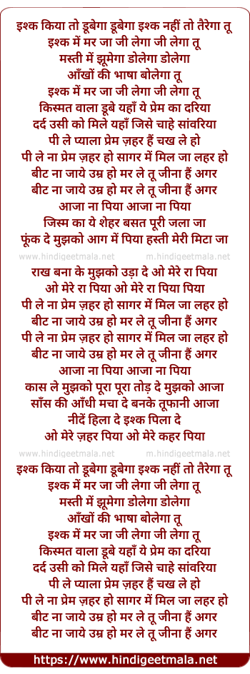 Lyrics of Ishq Kiya To Dubega Dubega - इश्क किया तो डूबेगा डूबेगा