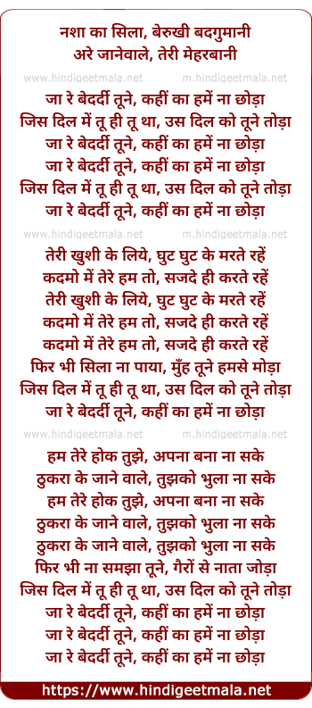 Lyrics of Ja Ra Bedardi Tune - जा रे बेदर्दी तूने