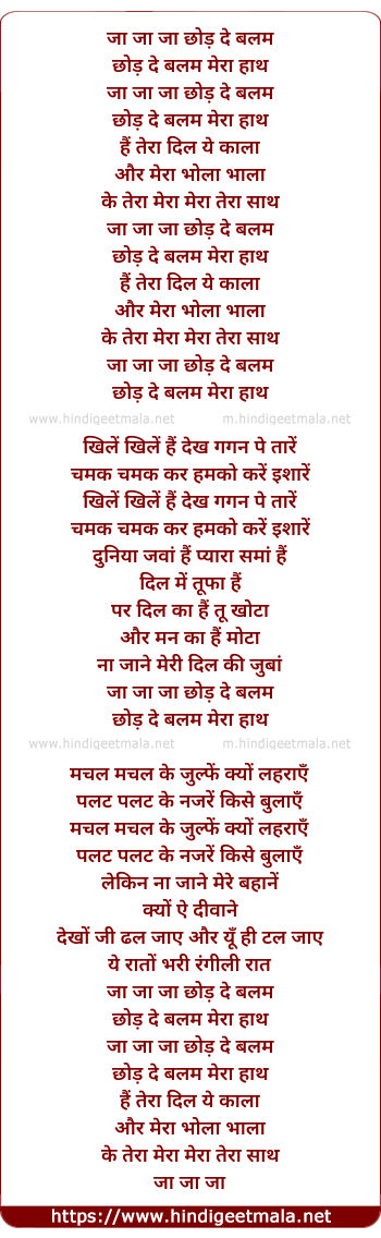 Lyrics of Ja Ja Ja Chhod De Balam - जा जा जा छोड़ दे बलम