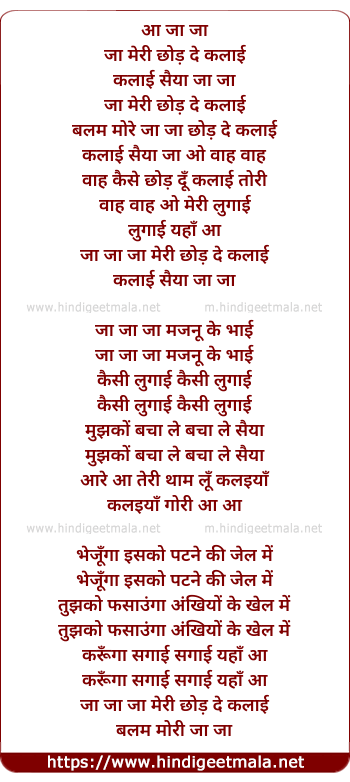 Lyrics of Ja Ja Re Ja Chhod De Kalaai - जा जा रे जा छोड़ दे कलाई