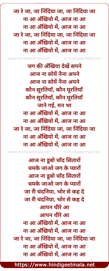 Lyrics of Ja Re Ja, Ja Nindiya Ja, Ja Nindiya Ja - जा रे जा, जा निंदिया जा, जा निंदिया जा