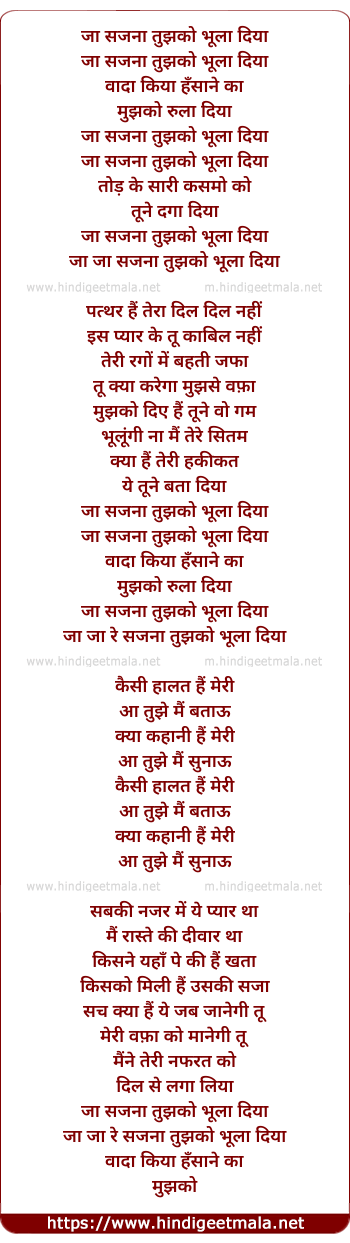 Lyrics of Ja Sajna Tujhko Bhula Diya (Sad) - जा सजना तुझको भूला दिया