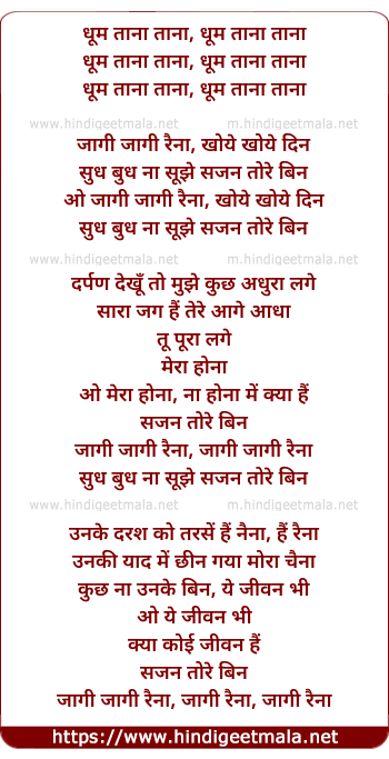 Lyrics of Jaagi Jaagi Raina - धूम ताना ताना, धूम ताना ताना