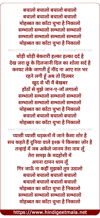 Lyrics of Muhabbat Kaa Kaantaa Chubhaa Hai - मोहब्बत का काँटा चुभा है