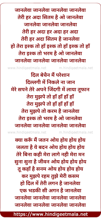 Lyrics of Jaan Leva Teri Har Ada Jaan Leva - जान लेवा तेरी हर अदा जान लेवा