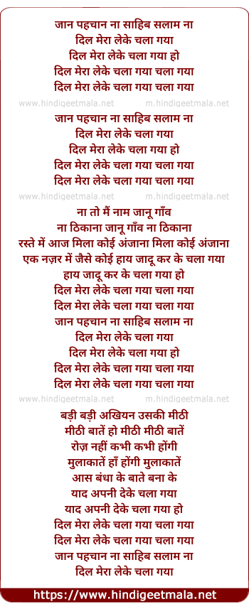 Lyrics of Jaan Pehchan Na Sahab Salam Na - जान पहचान ना साहिब सलाम ना