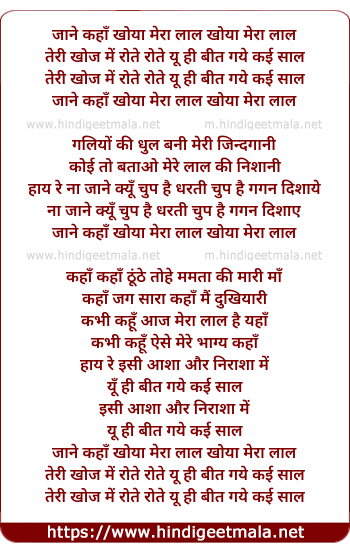 Lyrics of Jane Kahan Khoyaa Mera Laal - जाने कहाँ खोया मेरा लाल