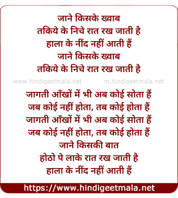 Lyrics of Jane Kiske Khwab, Takiye Ke Neeche Raat - जाने किसके ख्वाब, तकिये के नीचे रात