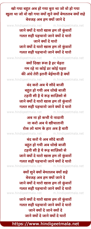 Lyrics of Jaane Kyun De Yaaron - जाने क्यों दे यारों