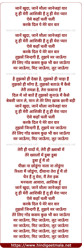Lyrics of Jane Khuda Jane Maula Janejaha Yar - जानें खुदा जानें मौला जानेजहां यार