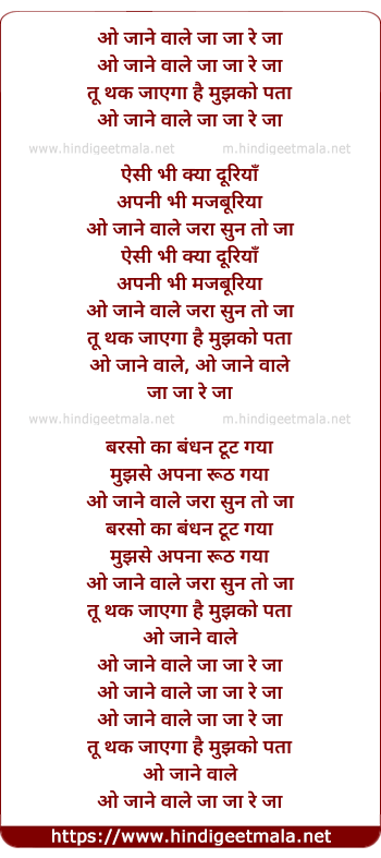 Lyrics of Jaane Wale - ओ जाने वाले जा जा रे जा